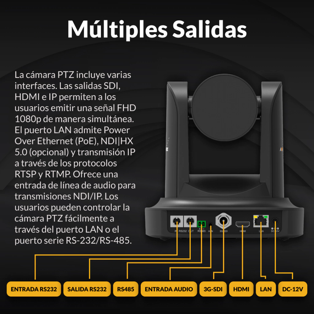 La cámara PTZ incluye varias interfaces. Las salidas SDI, HDMI e IP permiten a los usuarios emitir una señal FHD 1080p de manera simultánea. El puerto LAN admite Power Over Ethernet (PoE) y transmisión IP a través de los protocolos RTSP y RTMP. Ofrece una entrada de línea de audio para transmisiones NDI/IP. Los usuarios pueden controlar la cámara PTZ fácilmente a través del puerto LAN o el puerto serie RS-232/RS-485.